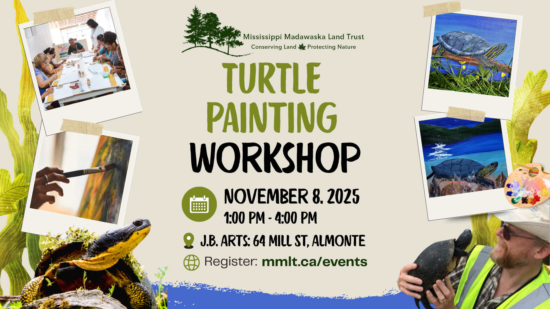Create your own turtle-inspired painting in a fun, step-by-step class guided by local artist Donna Naprstek. Enjoy a welcoming, easygoing atmosphere — no experience is needed, and all art supplies are provided. Donna has been painting with watercolours and acrylics for over 30 years and has taught classes in Carleton Place and Revelstoke, BC. She finds joy in using art to connect people with nature and to support turtle conservation.