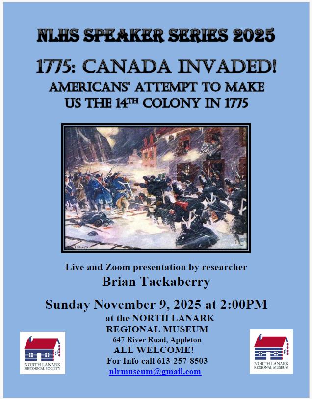 On November 9, the North Lanark Historical Society will be hosting our next speaker series: 1775: Canada Invaded!, presented by Brian Tackaberry.