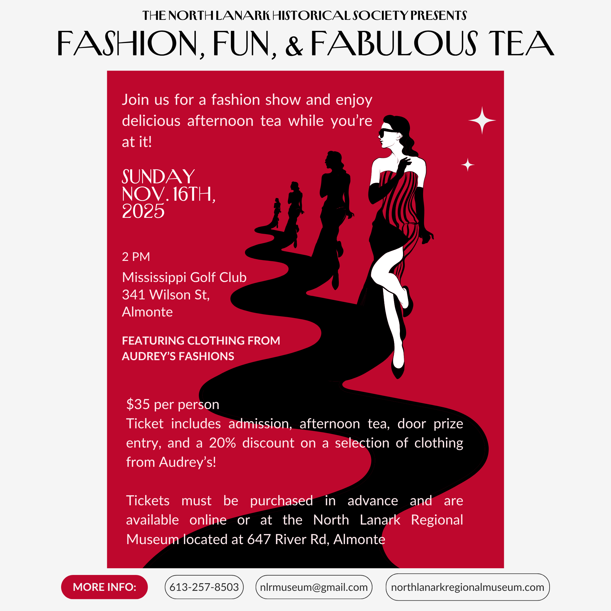 Join us for a stylish afternoon in support of the North Lanark Historical Society! Enjoy a fashion show by Audrey’s Fashions, complete with afternoon tea, door prizes, and a 20% discount on select clothing.