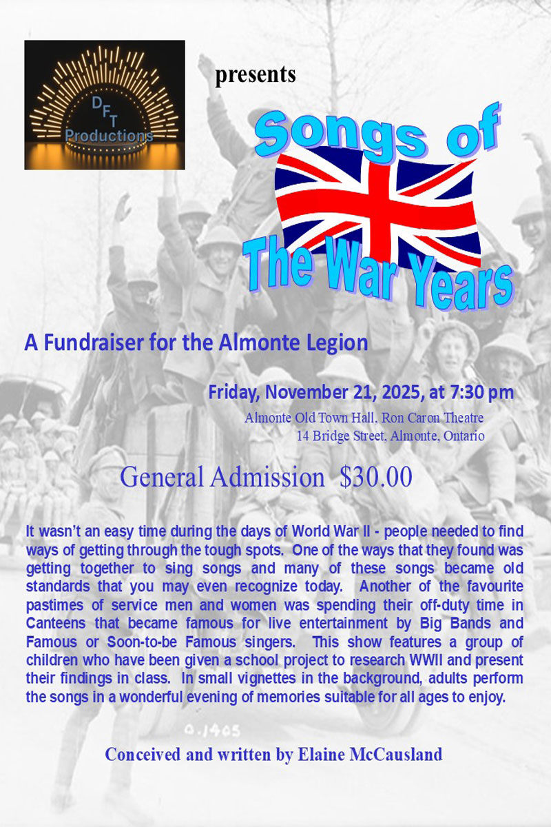 Support fundraising efforts for the Almonte Legion at Songs of the War Years, a look back at popular music during the Second World War. Presented by DFT Productions, it takes place at the Almonte Old Town Hall Auditorium, beginning at 7:30 p.m.