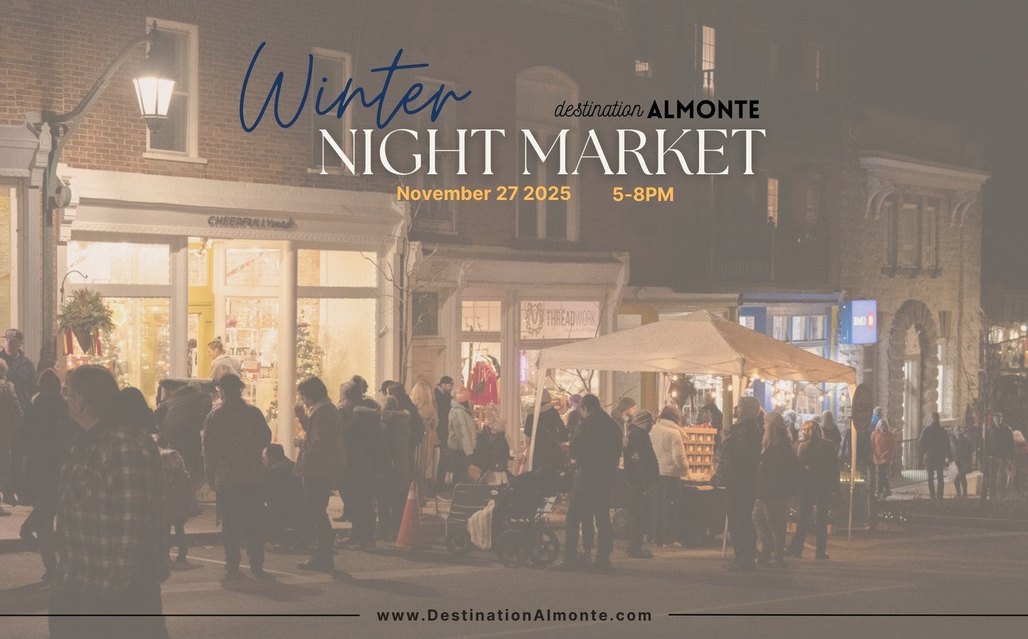 The businesses of the Destination Almonte Association are thrilled to invite you to our Winter Night Market! Join us Thursday, November 27 from 5-8 pm for an evening of live music, sidewalk sales, vendor pop-ups, street treats, and small-town fun.