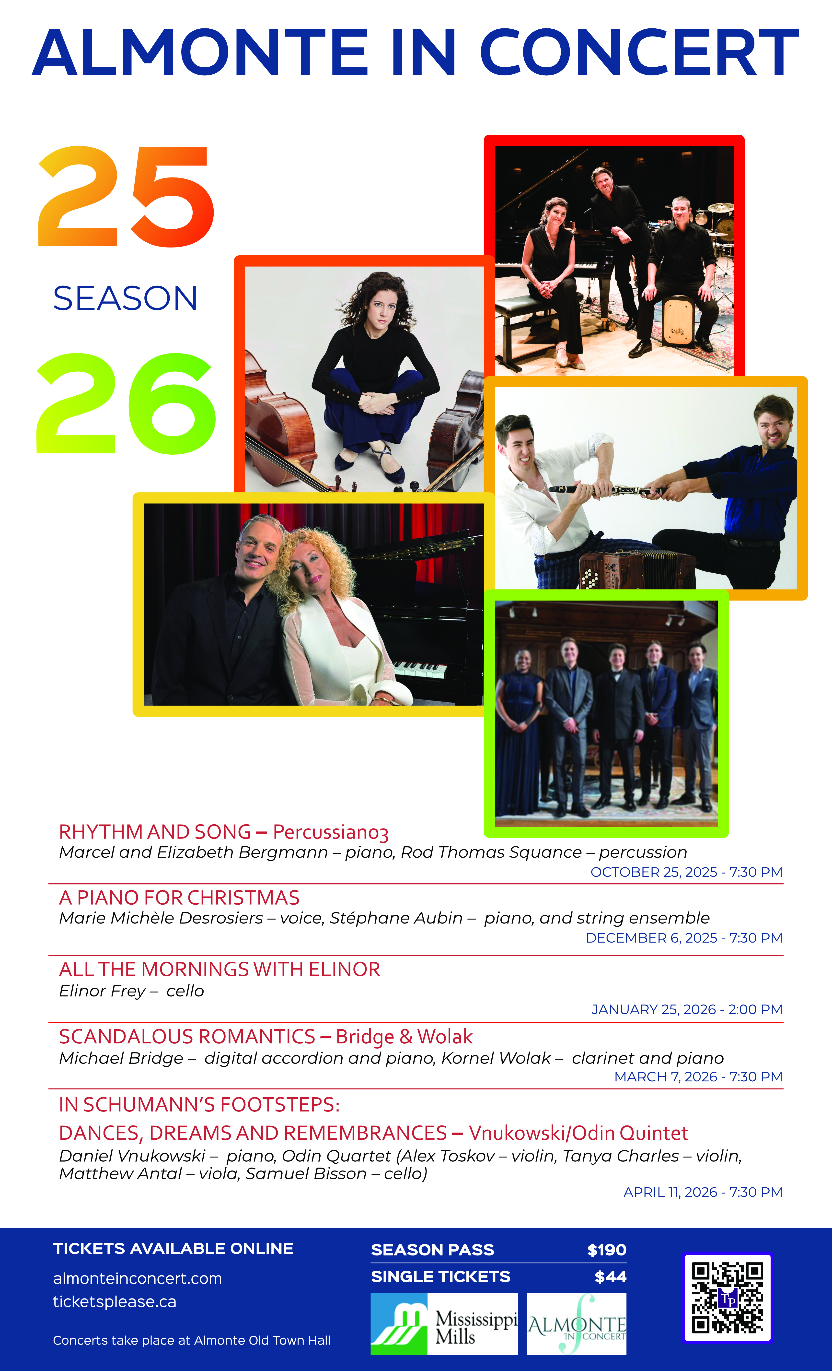 Almonte in Concert presents a series of exciting and varied chamber music concerts performed by nationally and internationally acclaimed musicians in the historic and acoustically superb setting of Almonte Old Town Hall.